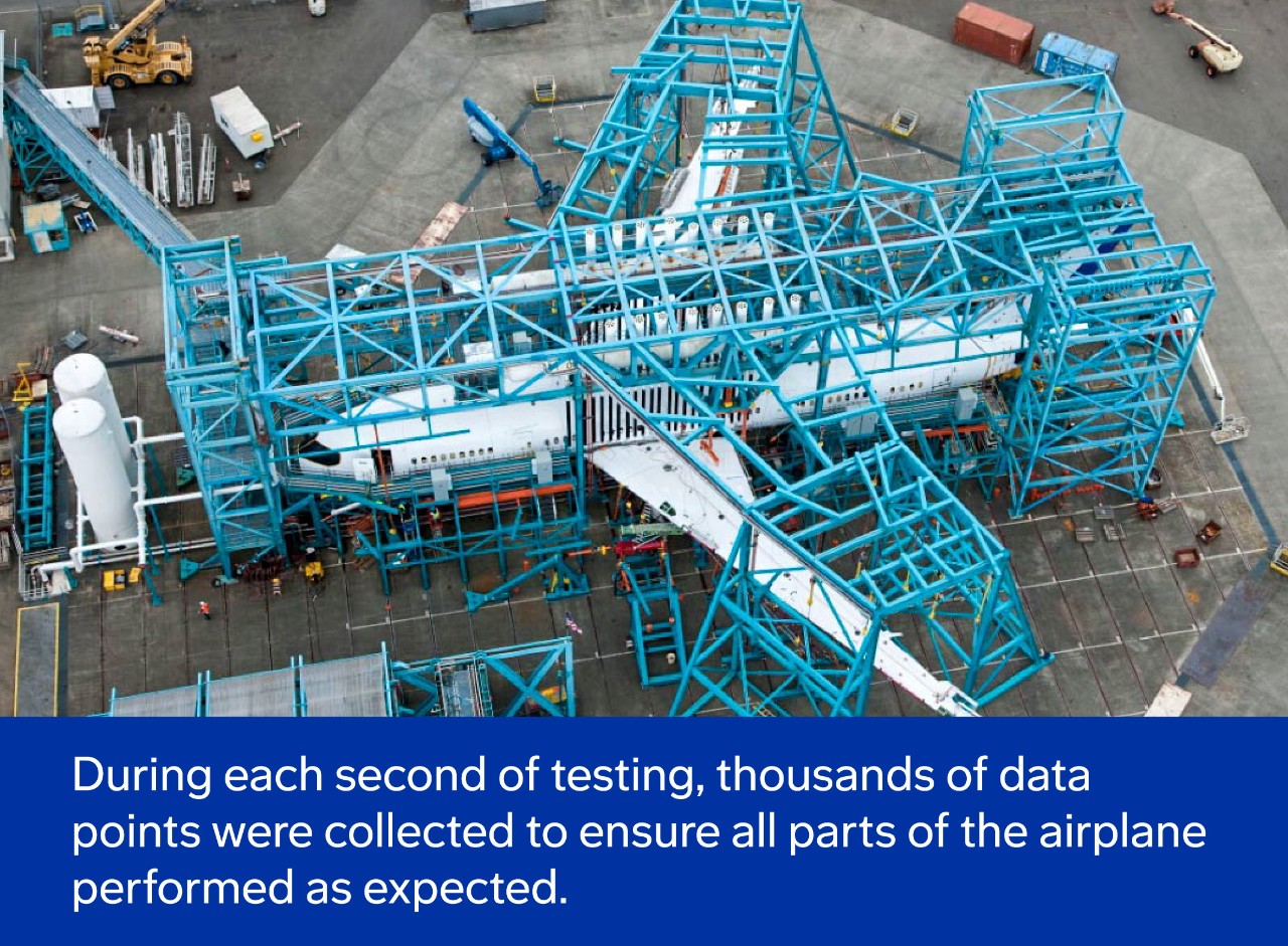 Supported by a 1.2 million-pound (544,000-kilogram) test rig, the airplane’s wings, fuselage and tail were attached to load fittings. Hydraulic jacks then applied loads to the airplane, which pushed and pulled the wings and fuselage to simulate all phases of flight and evaluated the durability of the airplane in a variety of conditions over lifetimes of service. During each second of testing, thousands of data points were collected to ensure all parts of the airplane performed as expected.