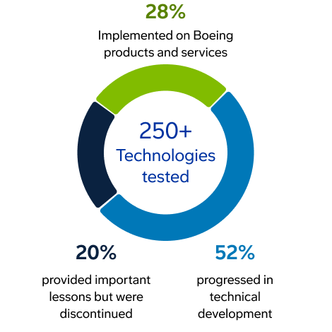 Twelve airplanes have served as flying test beds for the program since it began in 2012. In 2023, Boeing expanded the program with “Explorer” airplanes that focus on short-term testing of an individual technology. Since the program began, the ecoDemonstrator program has evaluated more than 250 technologies – 28% have progressed onto our products and services, 52% are still being matured and 20% provided helpful learnings but were discontinued.