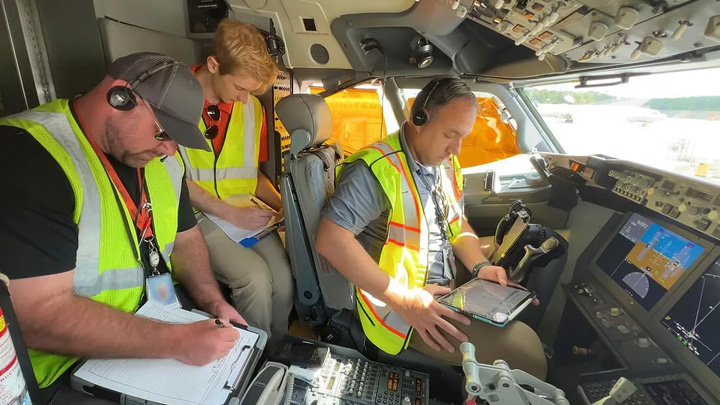 Boeing tested the enhanced capabilities of electronic flight bag application, Jeppesen’s updated FliteDeck Pro, such as an algorithm providing in-flight advisories to improve fuel consumption, and the ability to use real-time and historical data to predict taxi times. Qatar Airways Capt. Khalid Issa A M Al-Hamadi (left) joined a Boeing ecoDemonstrator test flight to preview the update.